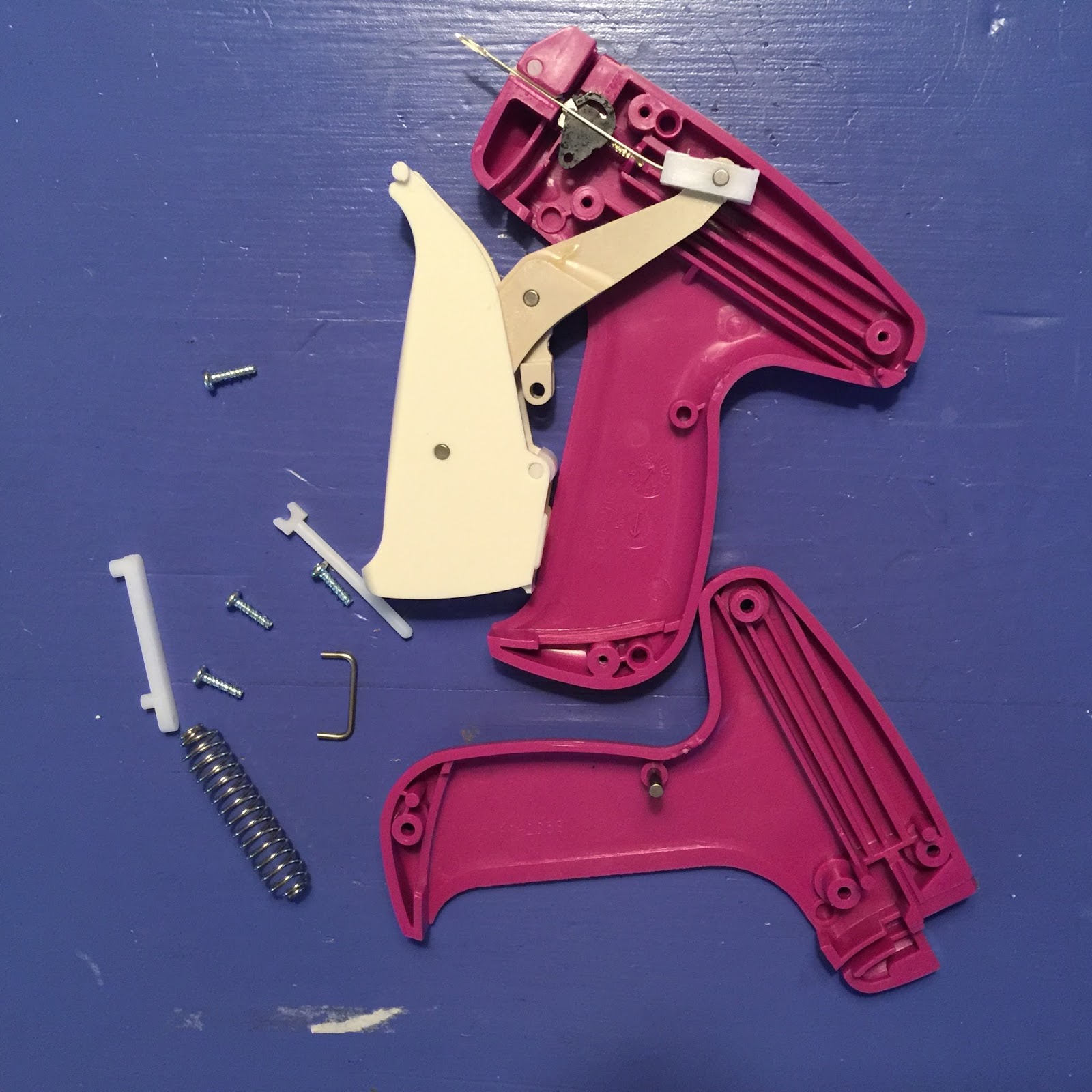 If that happens–PLEASE DO NOT REMOVE THE SCREWS IN THE TOOL!!! Otherwise the above photo is what you will get. If a jam occurs, simply turn the needle lock towards the nose of the tool and pull gently to get the needle out . This will release the trigger of the tool and the jam should be solved. Then reinstall the needle. If you get a tak end stuck in the needle channel, you can remove it by sliding a needle along the channel to the point of the needle. You are welcome to call us with other issues. We want happy basters ;-)) grins for your day,, bari